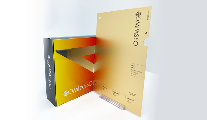 キャストコート紙の表面にアルミ箔(艶消し/ゴールド)を貼合した製品です。 ベース原紙は再生紙を使用しております。 |