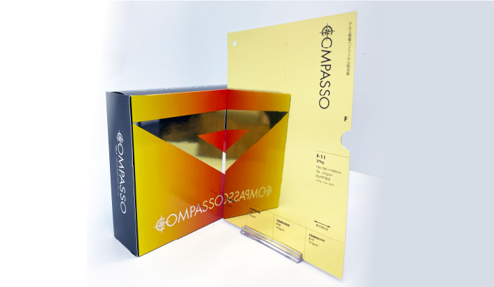 特徴 キャストコート紙の表面にアルミ蒸着ペットフィルム(ブルーゴールド)を貼合した製品です。