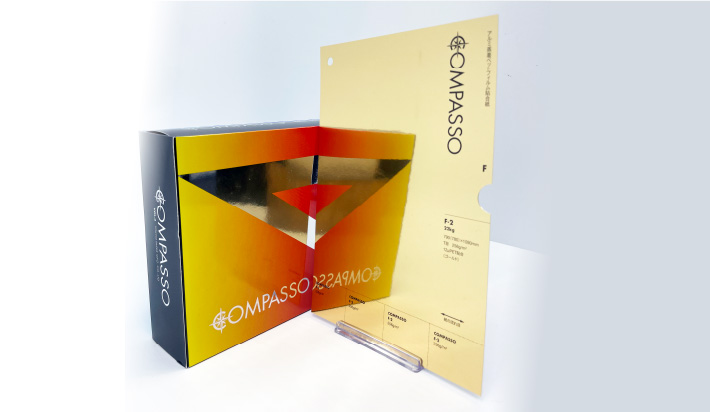 キャストコート紙の表面にアルミ蒸着ペットフィルム(ゴールド)を貼合した製品です。 ベース原紙は再生紙を使用しております。 |