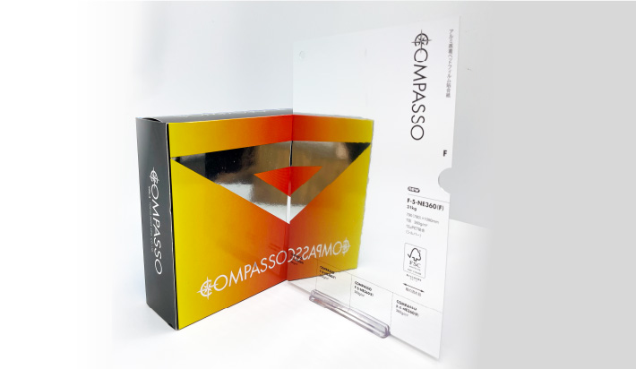 キャストコート紙の表面にアルミ蒸着ペットフィルム(シルバー)を貼合した製品です。 FSC森林認証紙です。 |