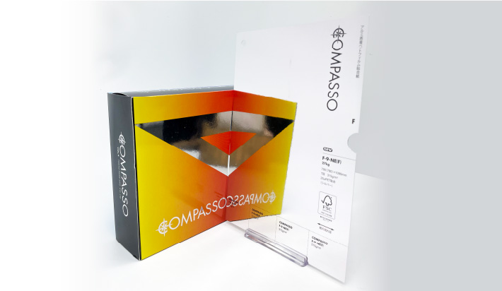 キャストコート紙の表面にアルミ蒸着ペットフィルム(シルバー)を貼合した製品です。 FSC森林認証紙です。 |