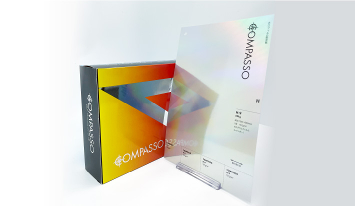 特徴 | A2コート紙の表面にホログラムフィルム(レインボー柄)を貼合した製品です。 |